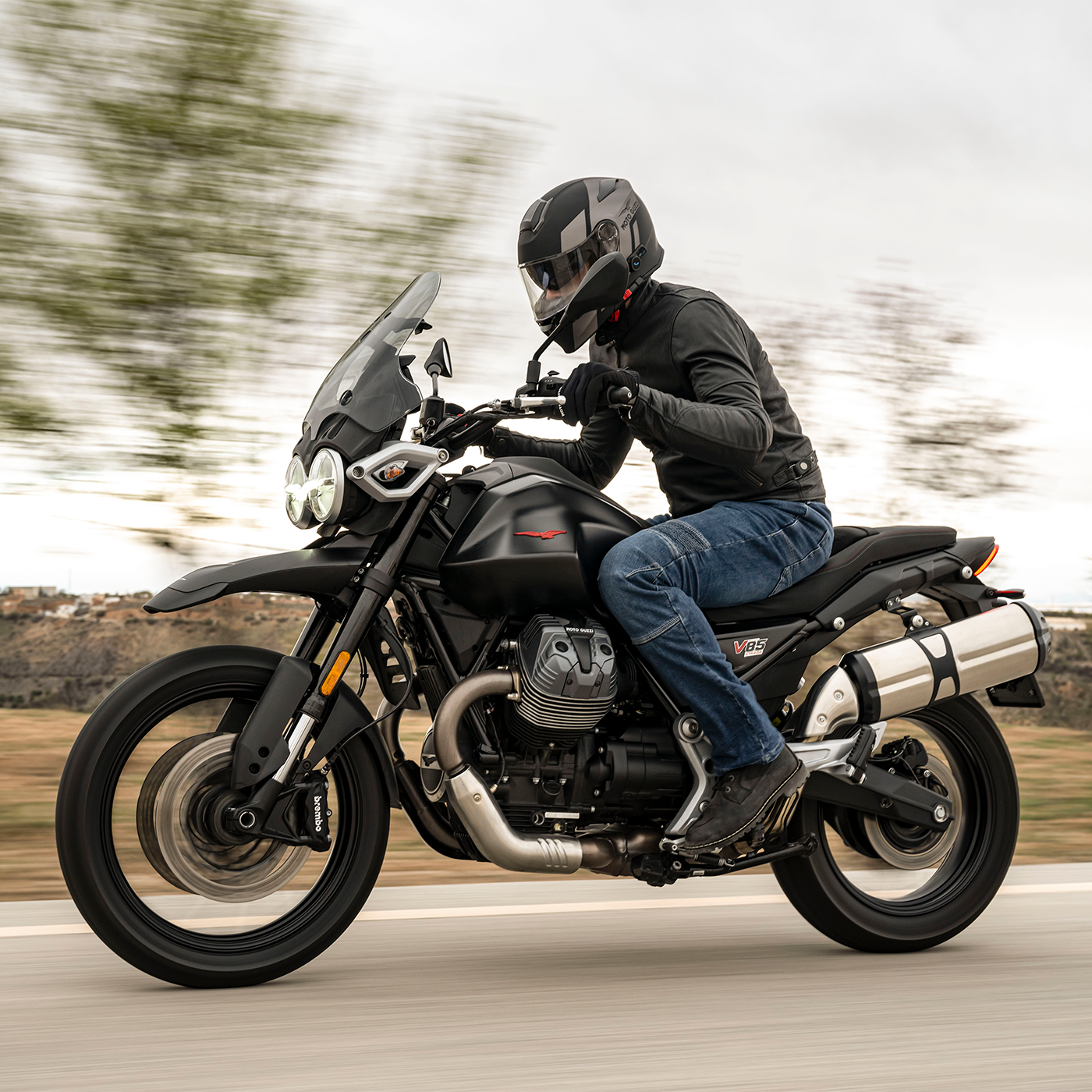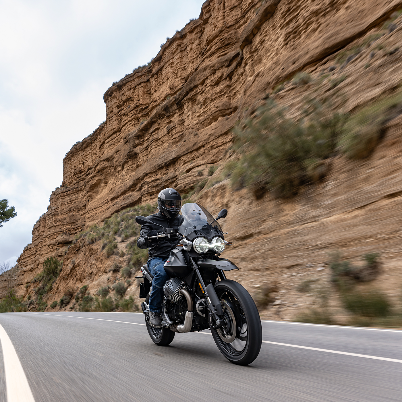 Essenziale, maneggevole e funzionale, la V85 TT trasforma anche il più semplice tragitto quotidiano in una vera avventura. Tra le sue linee scolpite spicca il bicilindrico trasversale a V di 90°, raffreddato ad aria, con distribuzione OHV e due valvole per cilindro, simbolo di orgoglio e tradizione dell’Aquila di Mandello. La cilindrata di 853 cc assicura una potenza massima di 76 CV e una coppia massima di ben 82 Nm a 5.000 giri. Non manca l’iconico serbatoio, con una capacità record di 23 litri, che garantisce oltre 400 km di avventure da vivere.